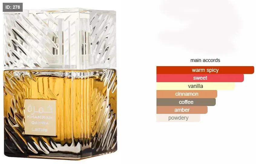 عطر "خمرة قهوة" من لطافة للعطور، عطر شرقي برائحة الفانيليا، للنساء والرجال. مناسب لفصلي الخريف والشتاء، ويعتبر خيارًا مثاليًا للمناسبات المسائية بسبب ثباته العالي ورائحته الغنية.