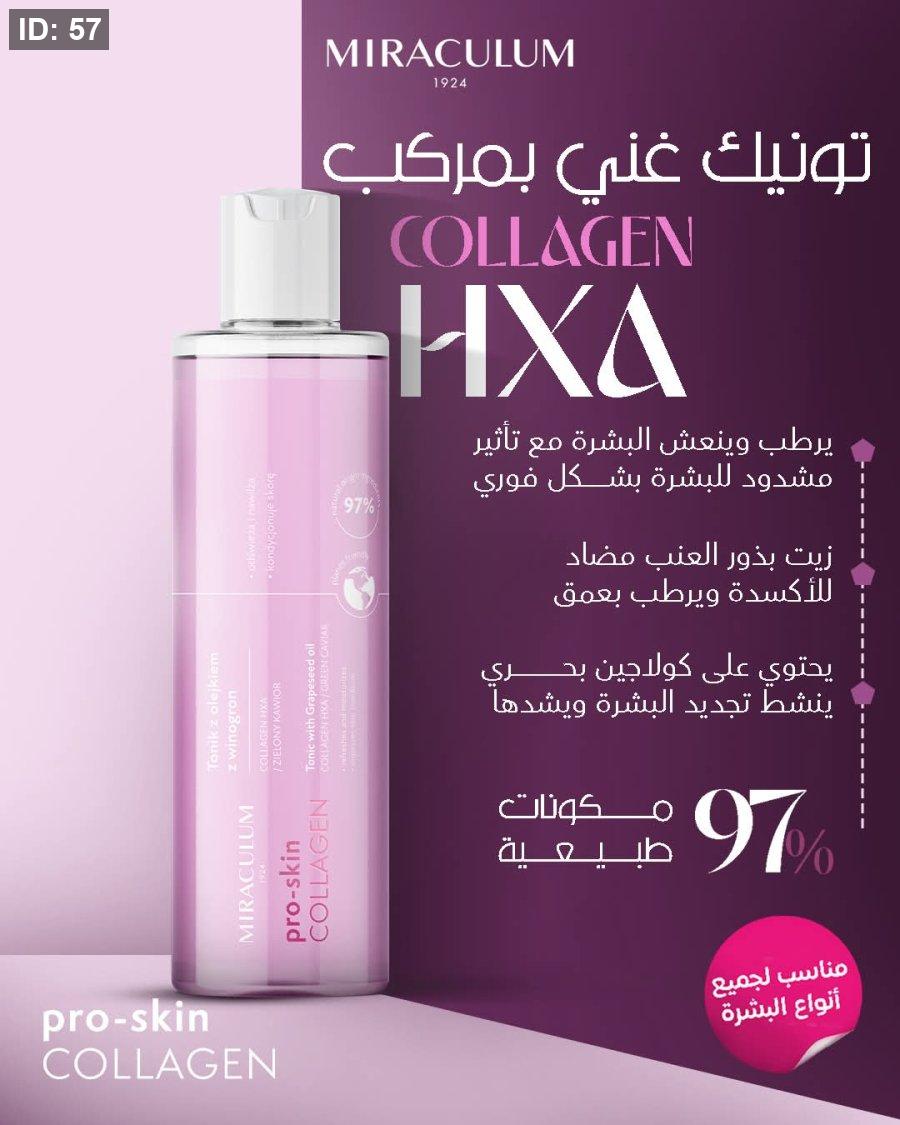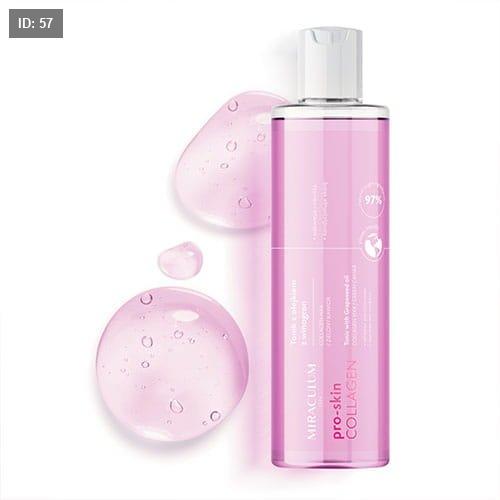 ميراكولوم كولاجين برو سكين تونيك بزيت العنب تركيبة هذا المركب النشطة بيولوجيًا تحفز إنتاج الكولاجين داخل الخلايا، مما يُجدد البشرة بشكل ملحوظ ويُحسّن حالتها.
